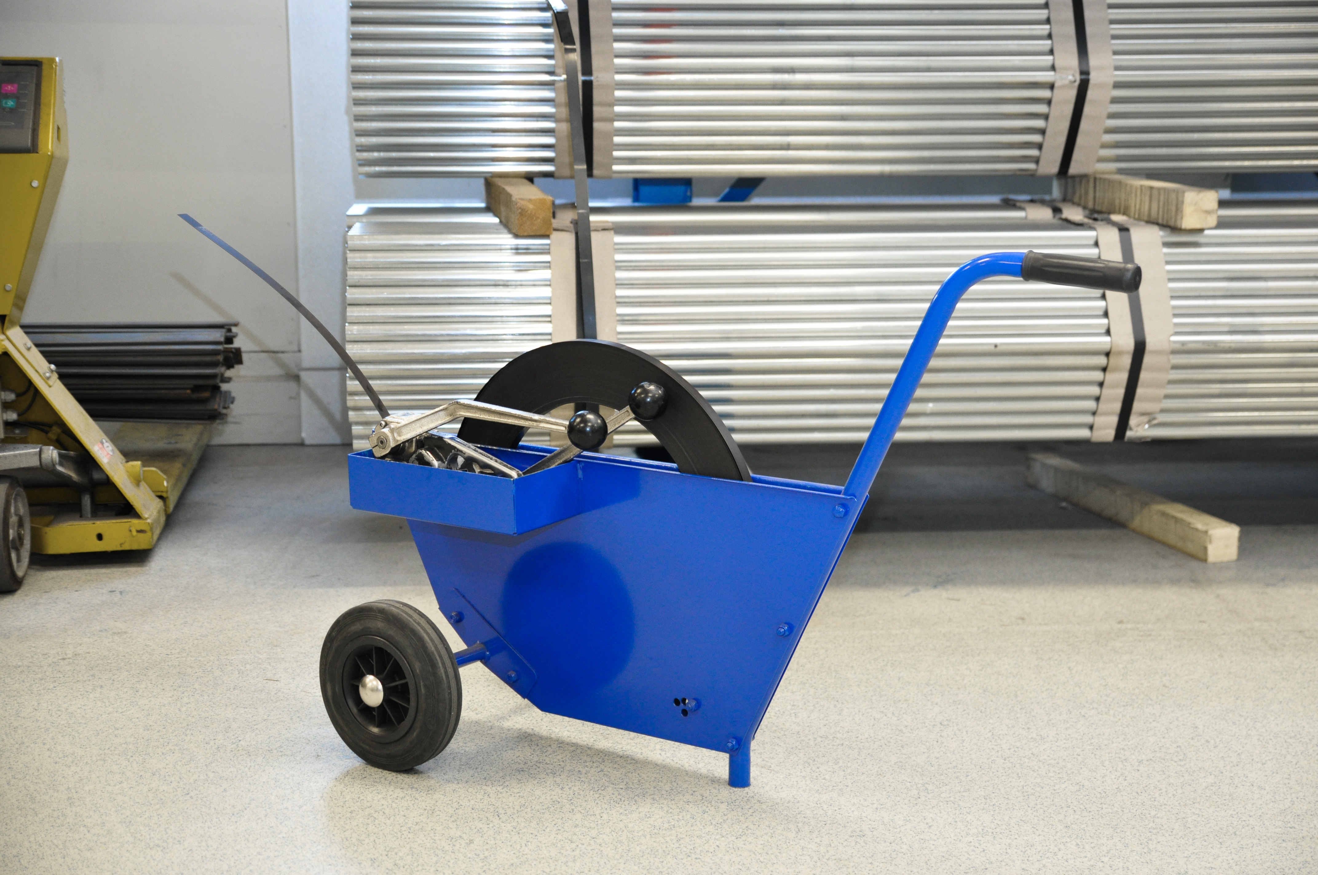 Powder coated Suits single-wound steel coil 16-19 mm wide Quick and easy changing of steel coil Spacious compartment for tools and accessories Coil tool and steel coil are not included Solid rubber wheels 200 mm