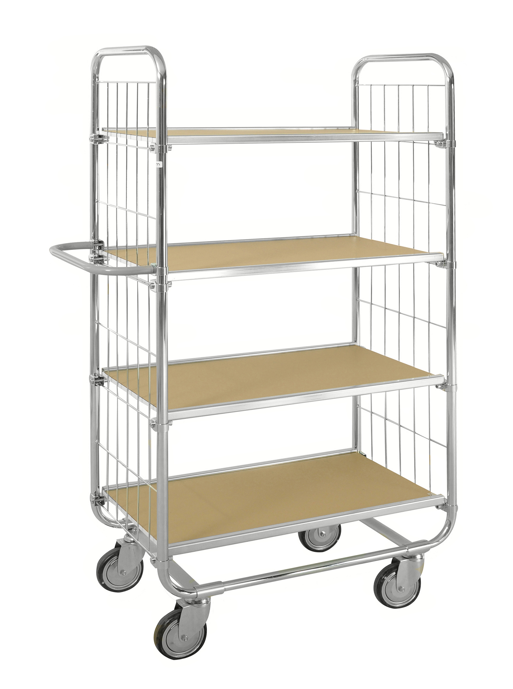 Flexible shelf trolley with a wide range of area of use. The shelves can be mounted on different heights after your needs. ESD Trolleys are equipped with dissipative carpets and are SP approved. All our carpets on the ESD trolleys withstand up to 400 °C of heat.