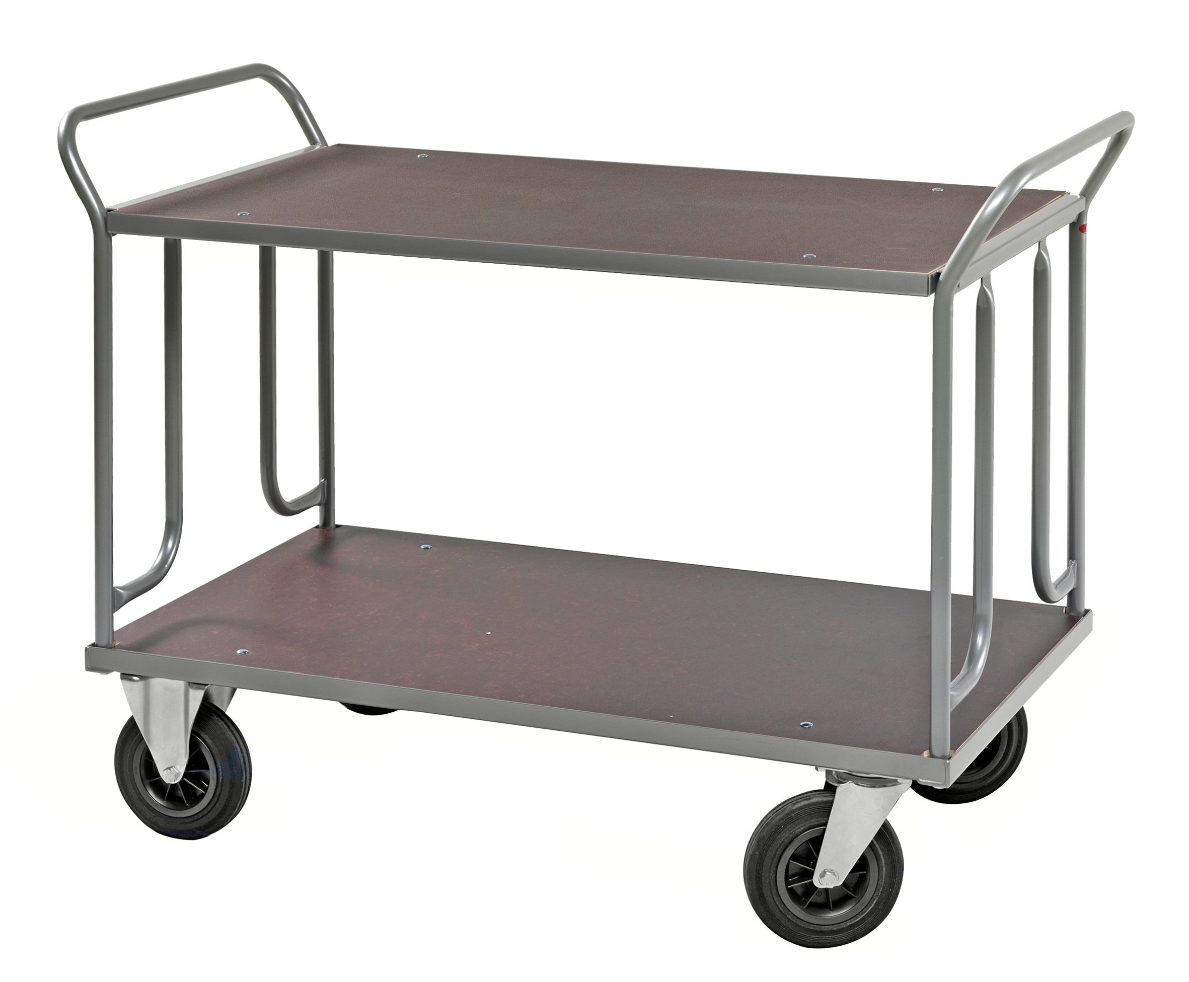 Powder coated panel platform truck with a large applications area. It is possible to add accessories as an extra end panel and shelf so it would fit your requirements perfectly. Available in different sizes and with or without brake.