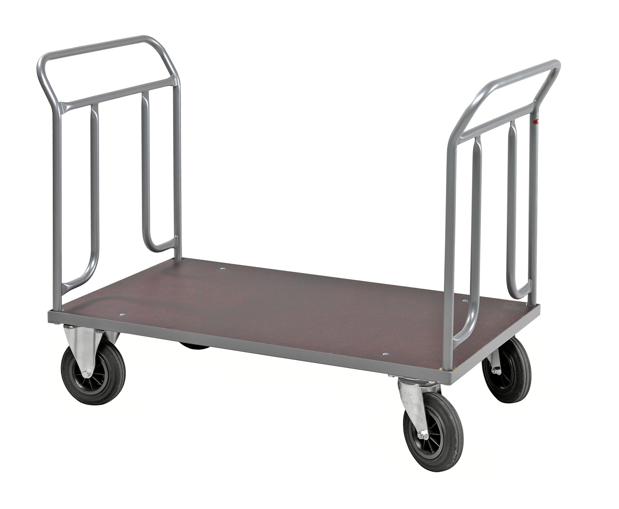 Powder coated panel platform truck with a large applications area. It is possible to add accessories as an extra end panel and shelf so it would fit your requirements perfectly. Available in different sizes and with or without brake.