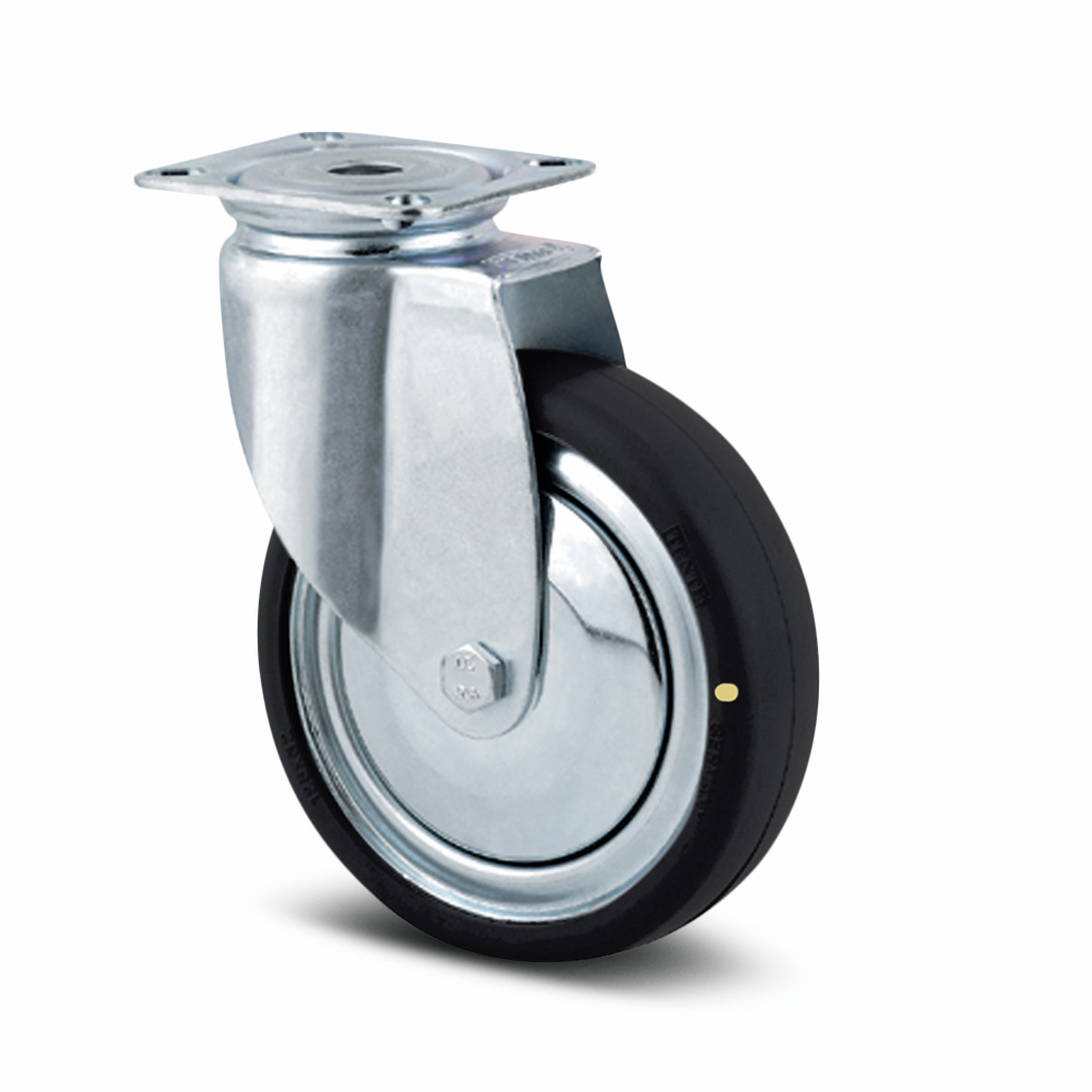 Wheel centre made of pressed steel, Tread: solid rubber black, non-staining, electric conductive, with threadguards, cone ball bearing
