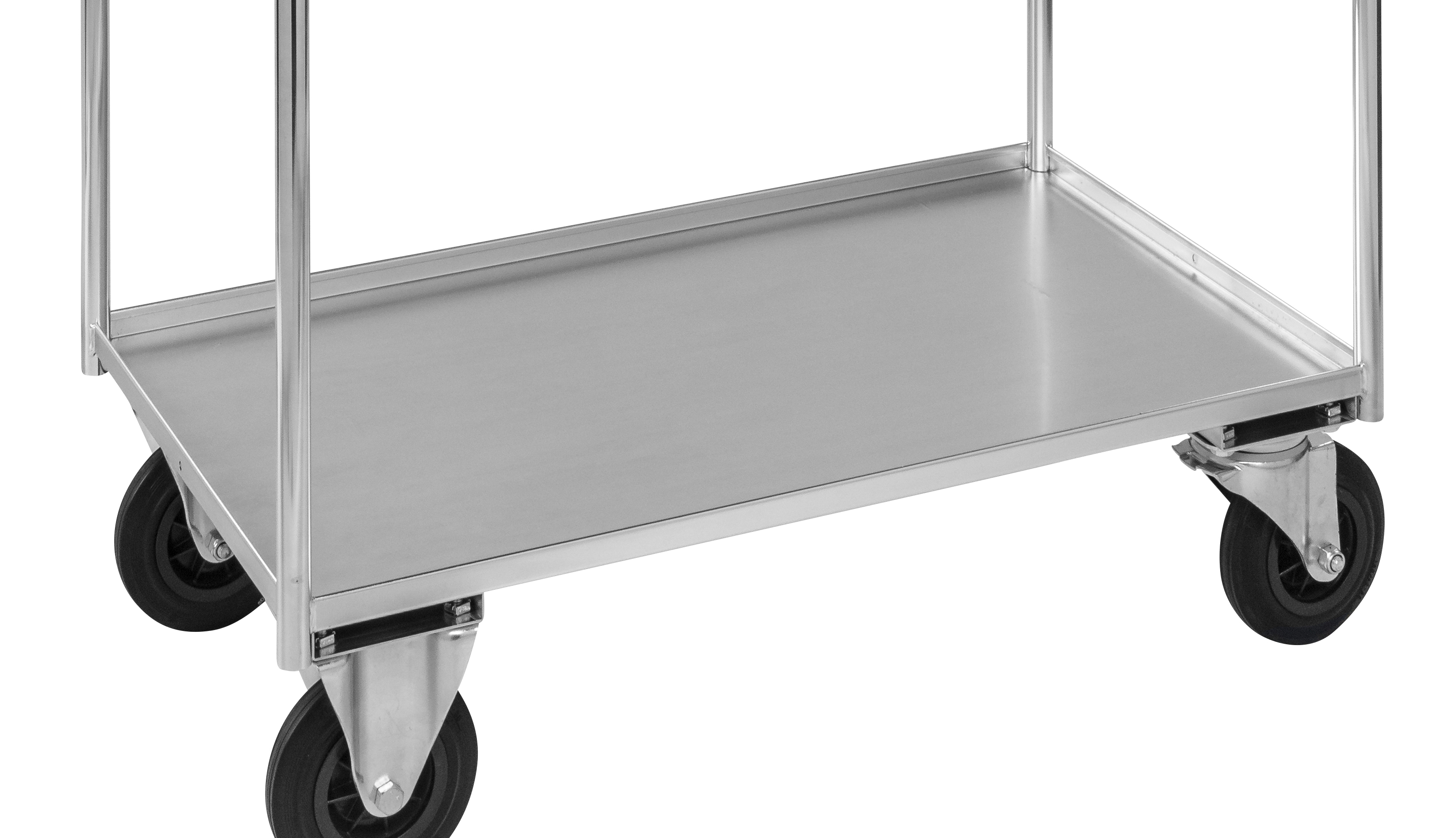 Fully welded robust trolley in sheet metal with rim, 3 shelves. Perfect for heavier objects.