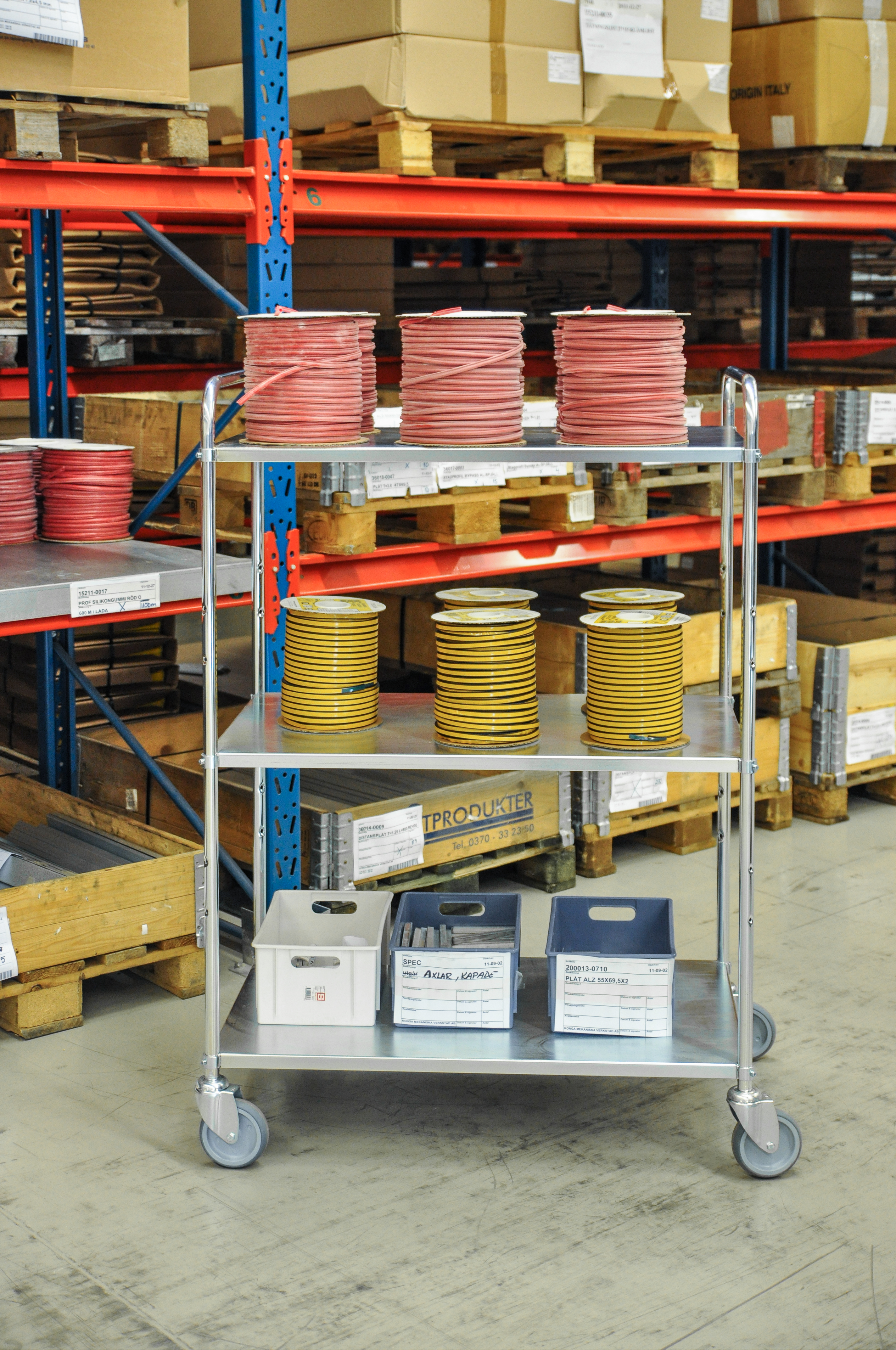 Tall trolley in sheet metal, 5 shelves. The shelves can be mounted with the edge down or up as per your need. Proper 125 mm castors which makes the trolley easy to handle. Availalble in different colors and sizes.