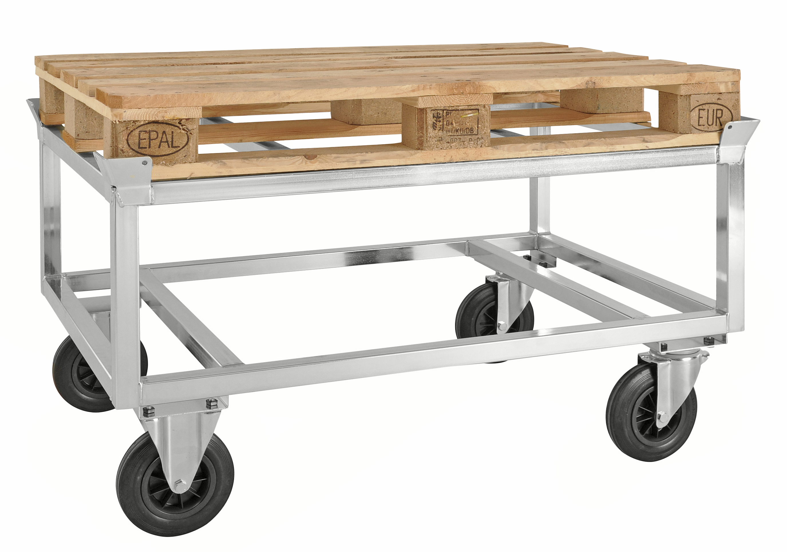 Electro galvanised and all welded with pallet holder Suited to EUR pallet 1200 x 800 mm Height to platform 650 mm 2 fixed and 2 swivel castors of solid rubber 200 x 50 mm Capacity: 800 kg
