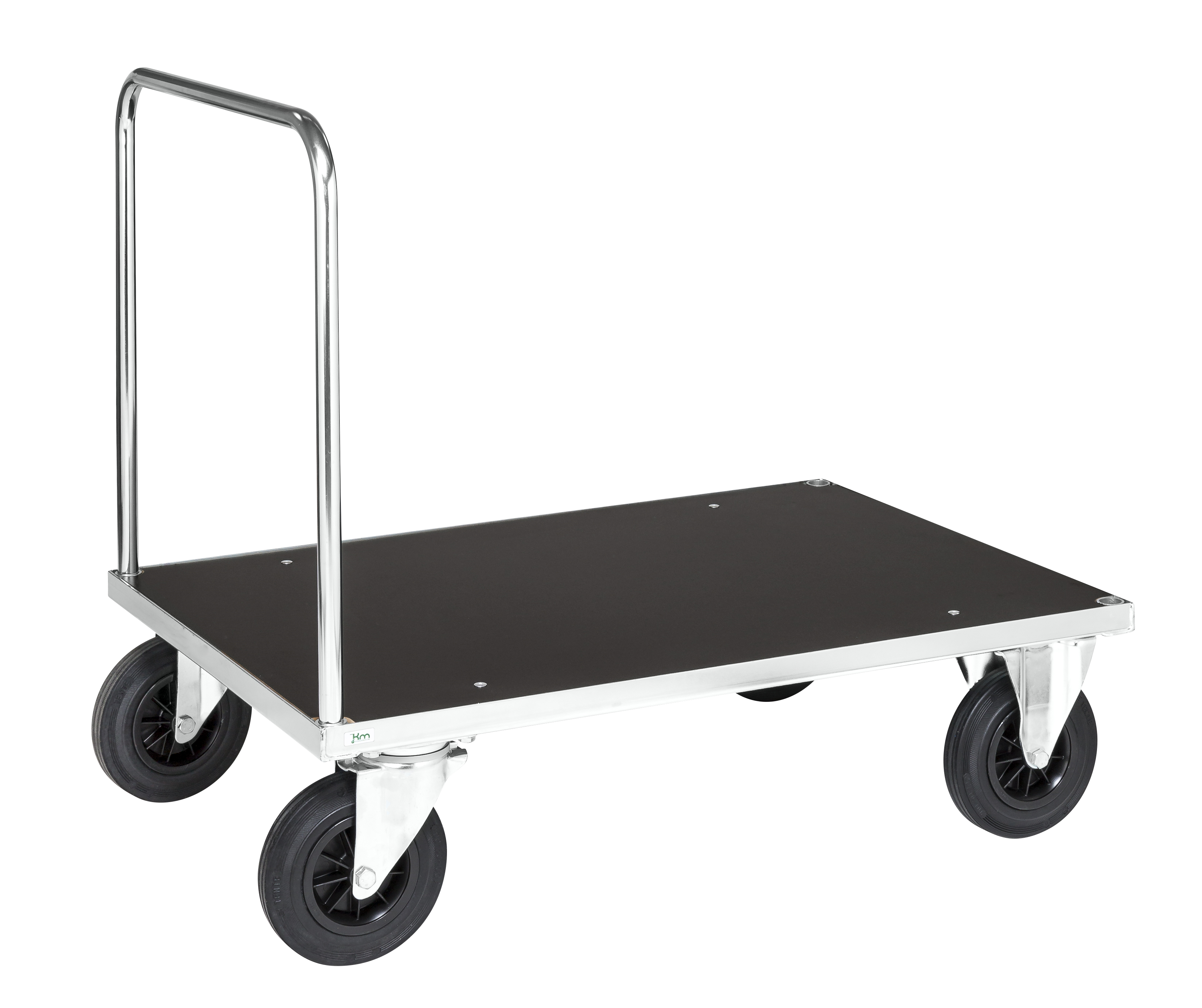 Electro galvanised with laminate shelfHeight to platform 260 mmHandles 25 mm steel pipe2 fixed 2 swivel castors solid rubber 200 x 50 mmCapacity: 500 kg
