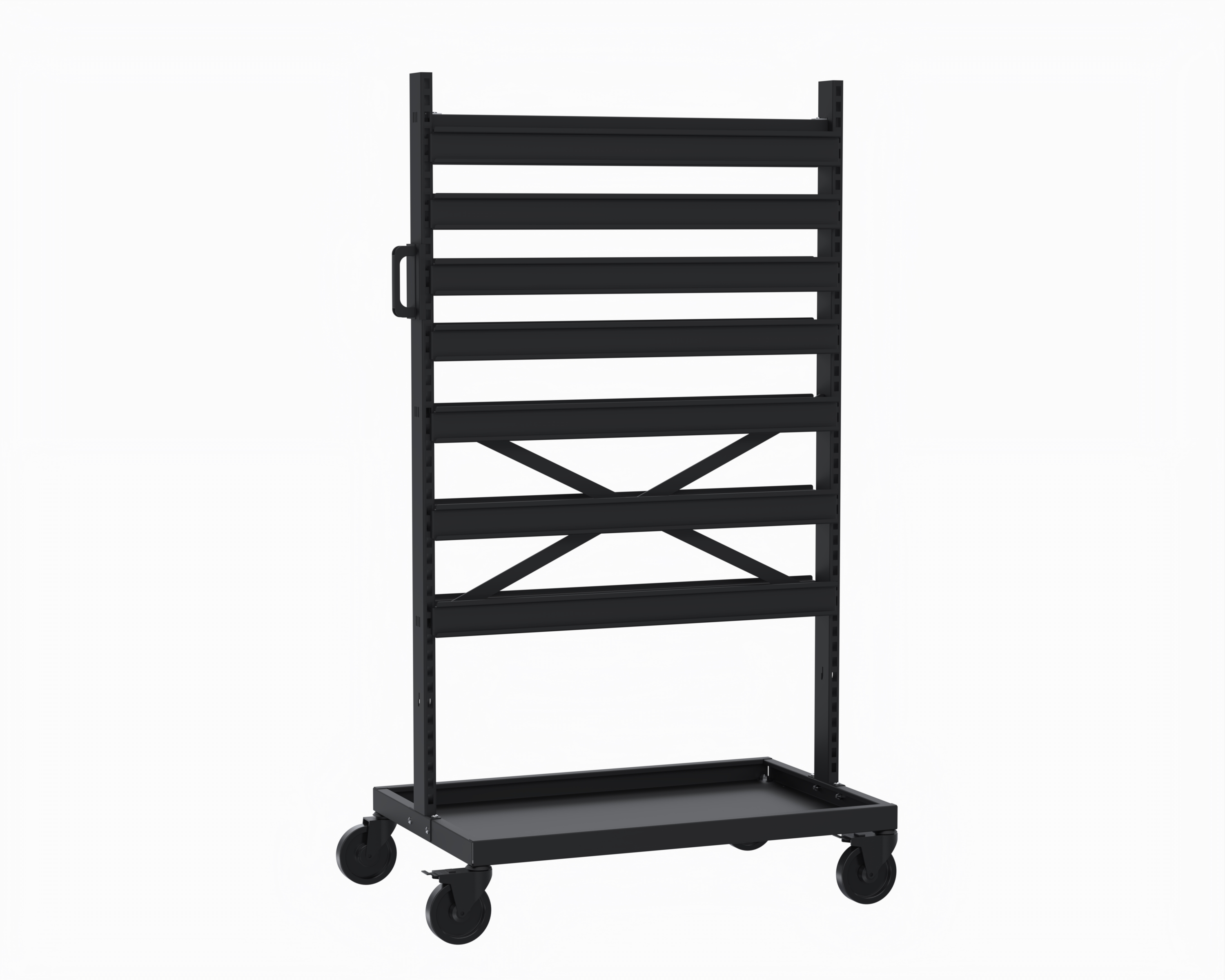 Double sided bin trolley with 14 height adjustable rails. Bins not included.